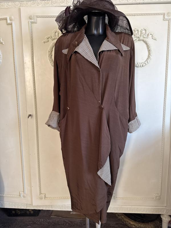 Дизайнерское винтажное платье миди. Франция. Цвет - коричневый. Состав:вискоза/ацетат (50/50). Очень сложный фасон, застежка спереди на ряд пуговиц (расстегиваются по всей длине), два кармана, рукав свободного кроя, декор (гусиные лапки в бежево-уоричнких тонах. Потрачено несколько пуговиц, также есть следы ношения (см. 2 последних фото). Но в целом-очень стильное платье. Эксклюзив. Размер по наборе-2 (францей). Замеры: длина-110 см, ПОГ-55 см, ПОБ- 52 см, рукав. От ворота-70 см(длина регулируется отворотом).