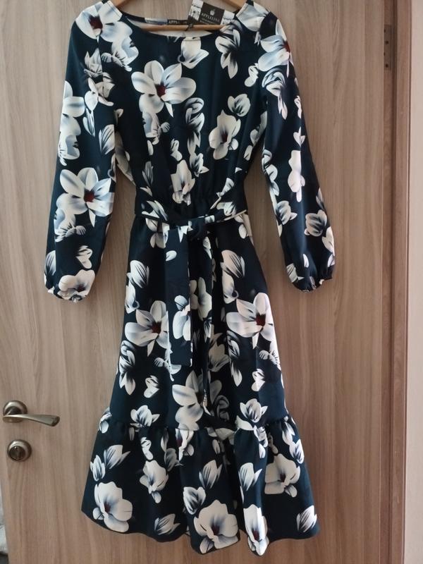 Новое женское платье изумрудного цвета с цветочным принтом, в поясе на резинке, имеет широкий пояс, рукав широкий внизу а резинке, длина платья 110см, длина рукава 58см, полу.обх.грудей 50-52см. размер UK 46-48.