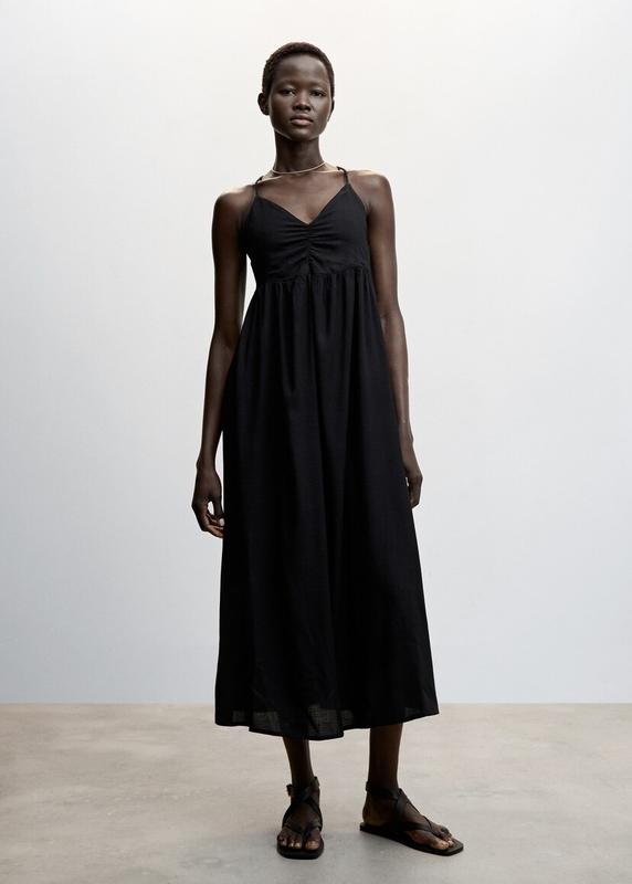 Mango На спині резинки, брителі не регулюються Збірка на грудях S розмір Склад: 100% віскоза. Підклад( на грудях): 100% бавовна Довжина згори брителі 125 Пог 35( тягнеться, резинка на спинці) Під грудьми 34 Талія, стегна вільно 60+
