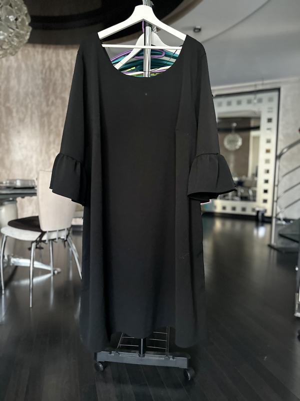 Сукня чорна Нова Волани на рукавах Рукав 1/2 Великі розміри р-р 58-60 Матеріал: 95% поліестер, 5% еластан Заміри: * плечі - 52см * груди - 76см * по низу подолу - 86см * довжина виробу _ 109см * довжина рукава - 48см