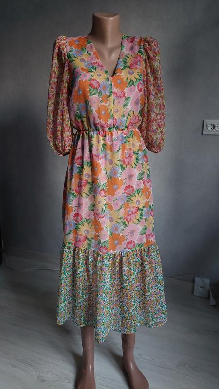состояние идеально р С подойдет и С-М, небольшая М шифонова в талии резиночка есть подкладка тканина не тягнеться смотрится стильно прекрасный освежающий летний вариант ярко, нежно, изящно модная длина замеры: длина 114 от 36-40 резиночка плечи 35 ос 65 рукав 41 ог 45 манекен рост 169 р С, ос 90 є безпечна оплата подписка 100 грн все виды пошт ежедневно