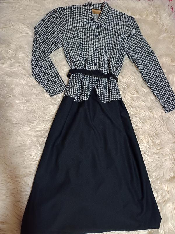 стан ідеальний плечі 40 пог 43 пот 35/40 пос 50 довжина 115 верхня частина на ґудзиках,з баскою, принт гусяча лапка на талії резинка і ремінець низ однотонний чорний позаду невеликий розріз внизу