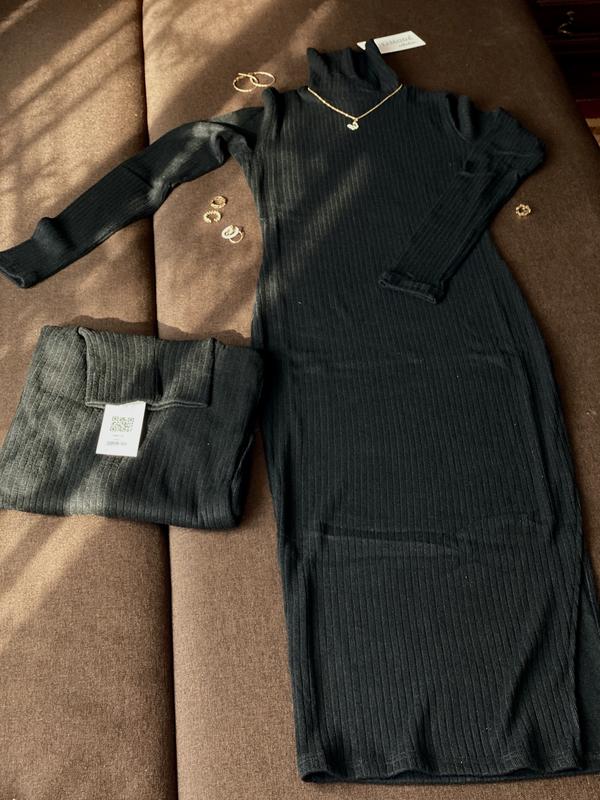 Черное платье с длинными рукавами, длиной меди и разрезом на ноге