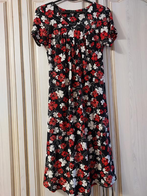 Платье легкое, летнее в красивый цветочный принт. Ткань микро масло. Сзади тоненький поясочек. длина до середины икры. Крой от груди легкая трапеция.Размер М, 46-48.Купалась в Германии.