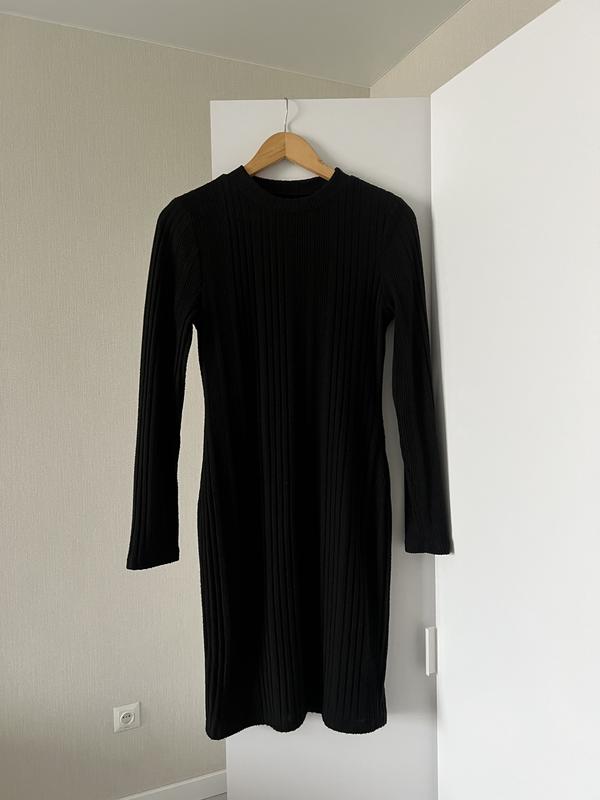 Черное платье длины миди в рубчик, в хорошем состоянии. Имеет незначительные катышки По дополнительной информации пишите в личные