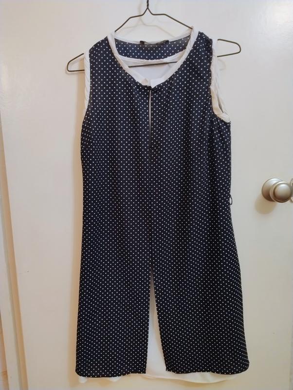 Цікава сукня під пояс з двойним складом, знизу легка біла комбінація, зверху накидка у принт горох, розмір S довжина міді на зріст 160см тобто трошки нижче коліна