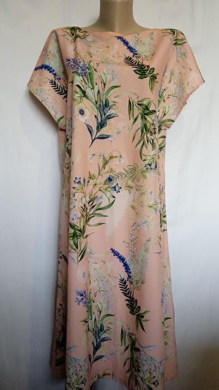 очень красивое платье,цветы восхитительные на нежно розовом поле, длинна105см,пог60,пояс полуобхват52-53,бежедра60,ширина по низу70см