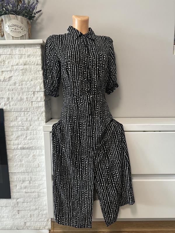 платье из вискозы черного цвета с белым абстрактным узором. Она имеет воротник-стойку, пуговицы спереди, короткие рукава с легким объемом и приталенный силуэт, который расширяется к низу. Длина • Размер: S-M • Длина: 117 см • Обхват груди: 46 см • Обхват талии: 38 см • Обхват стегон: 49 см Не забудьте подписаться на мой профиль,тут всегда можно найти большой выбор одежды, обновление каждую неделю и действуют всегда скидки