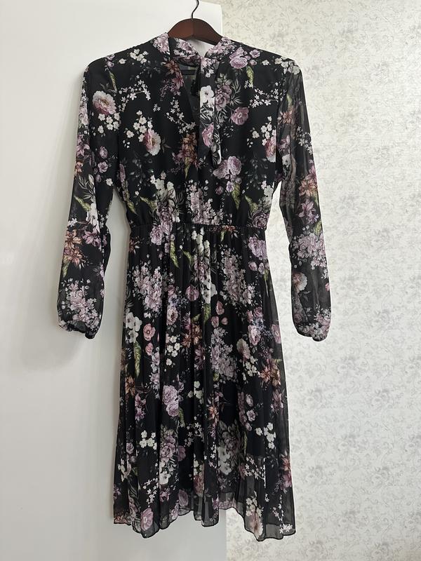 Платье шифоновое, цветочный принт, низ на подкладке, размер М, длина 99, плечи 40, полуобхват грудь 48 см, одетое 1 раз