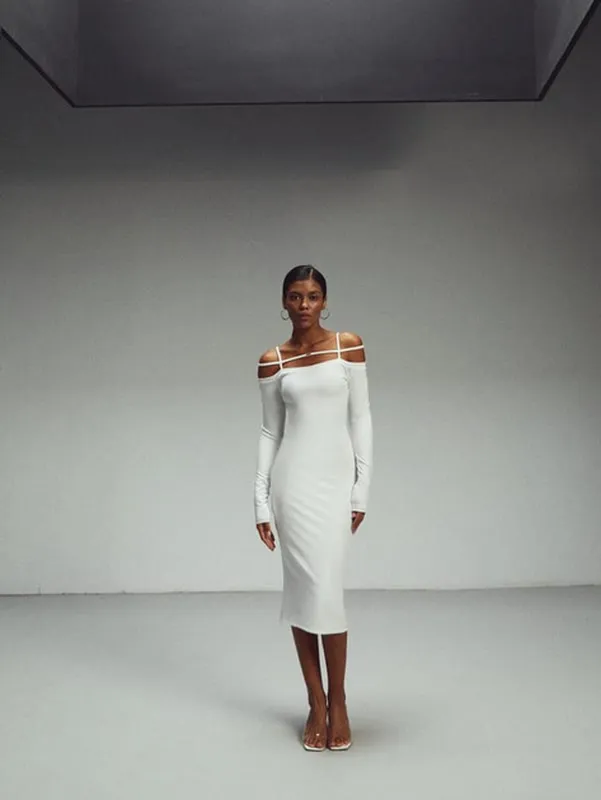 Молочное облегающее платье длины миди. Модель выполнена из легкой трикотажной ткани. Главным украшением платья стал глубокий вырез с тонкими бретелями, который подчеркивает плечи. Сзади на юбке предусмотрен разрез Одягала один раз.