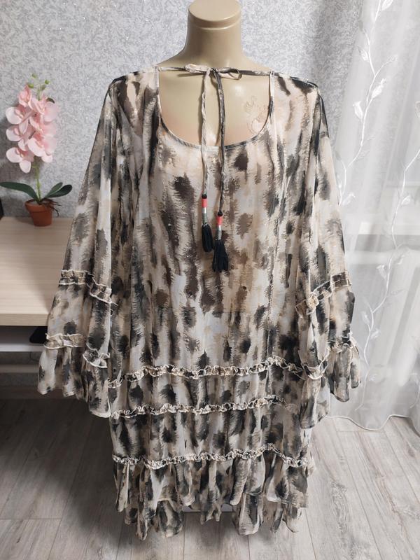 Женское бежево коричневое миди платье с оборками в бохо стиле, американского бренда Religion, с полиэстру размером 24,52-54, 2XL-3XL. В идеальном состоянии, свободного кроя, немного просвечивается, с длинным рукавом, и глубь белоснежным вырезом на спине с завязками косточками на шее. По бокам края платья немного удлиненные. Качество отличное, все замеры на фото.