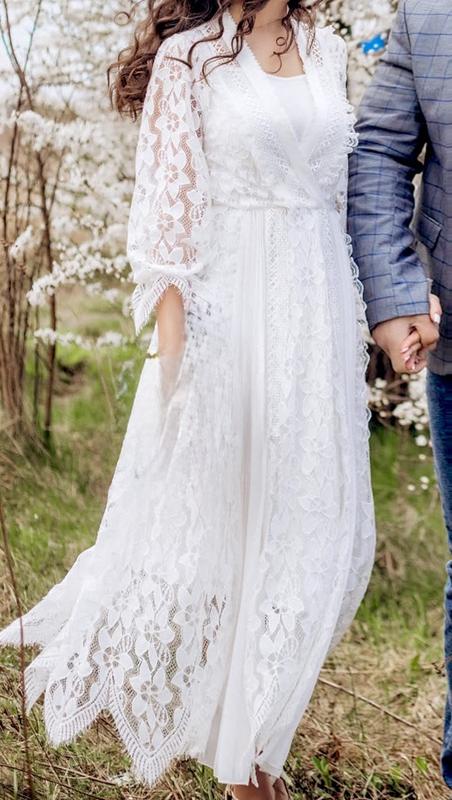 Впечатляющее элегантное платье для особых событий. Практично нова. Размер М. Нежно-молочного оттенка. Сочетает шифоновые вкладыши плиссе, кружево и рюши. На легкой подкладке, со скрытой застежкой сбоку. Рукава на резинке. Замеры: длина платья - 125 см, полуобхват груди - 46 см, полуобхват талии - 37см, длина рукава - 58 см.