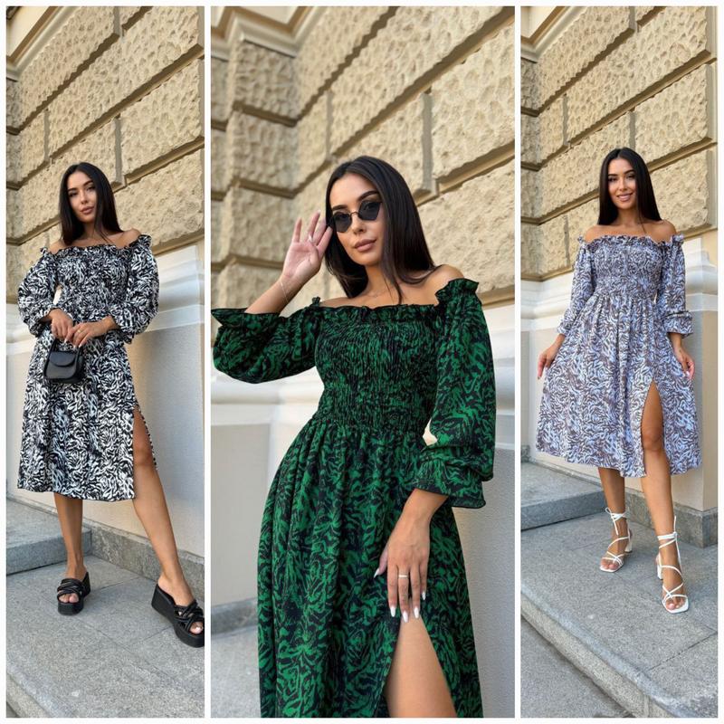 ❤️❤️❤️❤❤❤ Невероятно красивое платье с приспущенными плечами Легкое, удобное к телу платье, которое Вы будете неотразимым 😘 Модель:1513/АнРус/ Размеры: 42-44,46-48 Ткань: американский креп-жатка со стильным принтом Цвета:голубой, белый, зеленый Замеры 💛Обхват груди (42-44р)-70-140см (46-48р)-72-142см 💛Рукав 50см 💛Длина (42-44р)-97см, (46-48р)-103см