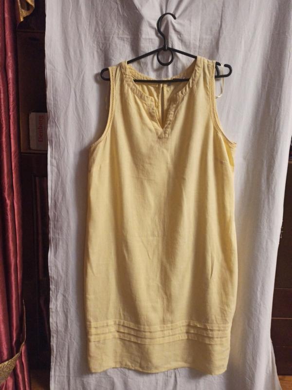 льняное платье светло-желтого цвета простого кроя, полупри-таленный силуэт. Ширина под проймой 54 см, по талии 53 см, по бедрам 57 см, длина 99 см Продажа по полной оплате на карту.