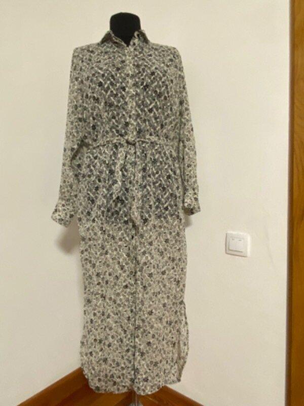 Платье - рубашка размер Л, демонстрировано на манекене 52 размера. Длина - 140см и 123см перед, см, плечи - 40см, рукав от плеча - 64см, пог - 60см, пот - 62см, поб - 65см.