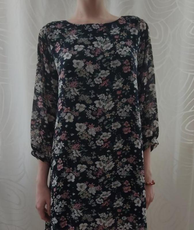 Шифоновое платье с цветочным принтом на подкладке, стиль свободный, насыщенные оттенки бирки отсутствуют, состояние идеальное на фото надето на размер S, рост 173 подходит также на размер М рукав 50, можно подворачивать по желанию Пог 48-49 Пот 47-48 длина 93 Поб 62 можно надевать под осеннюю курточку и не только