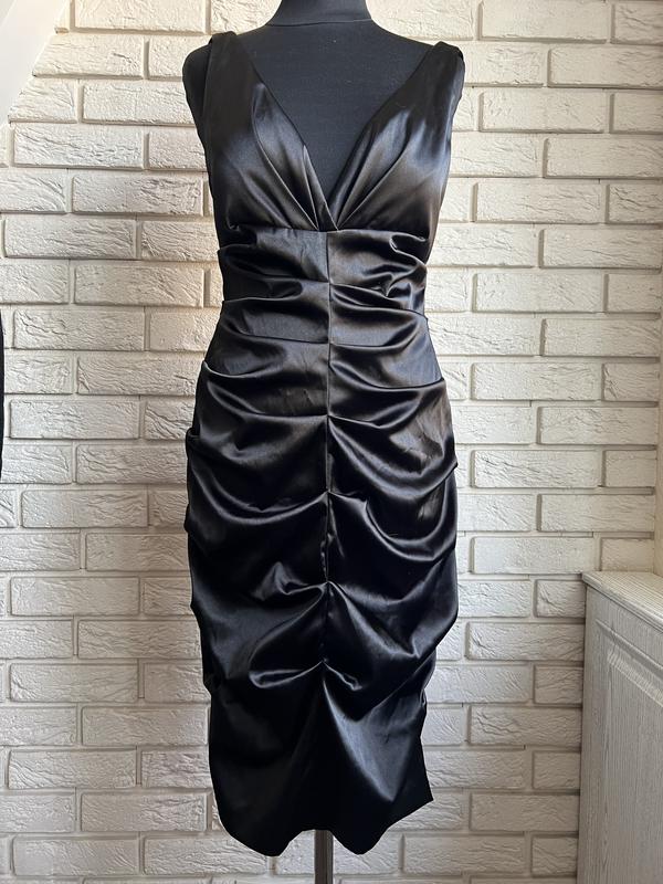 Черное платье бренда XSCAPE by Joanna Chen, красиво сидит по фигуре, размер 10. Тканина атлас стрейч. В лифте есть плотная подкладка. Ширина в груди 43 Стегна 48 Длина от плеча 100