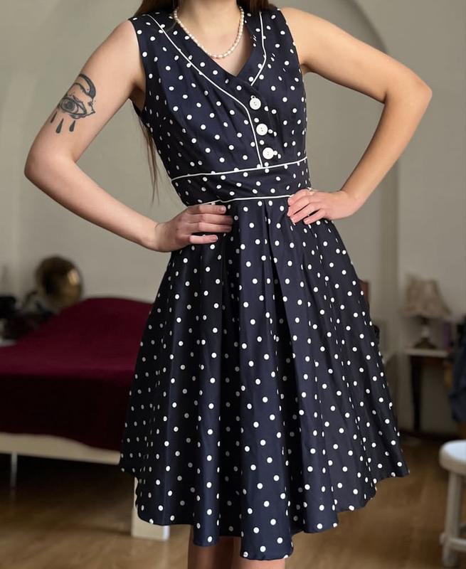 Волшебное современное платье в горошек в стиле 1950-х годов от бренда Joe Browns Красивый акцент на талии, пышная юбочка и интересный декор в виде пуговиц. Тканина 97% бавовна, 3% еластан, поэтому немножко тянется. Состояние употреблено, но очень очень очень хороший, без дефектов. Размер М Длина - 104 см Полуобхват грудь - 50 см Полуобхват талия - 41 см В бедрах свободно Мои параметры для сравнения 90, 73, 95 см. В талии и груди еще есть место. Можно дополнительно надеть поясок и подвес