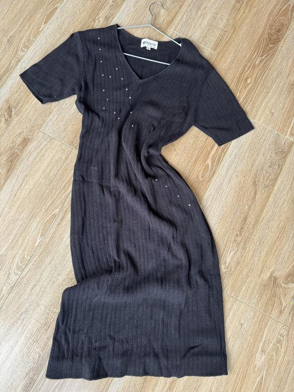 Платье женское Alterna У широкий рубчик, короткий рукав Состав вискоза64%/коттон36%, машинная мелкая вязка Полу обхват груди 40см, тянется Длина до колена Цвет темно-темно синий, почти черный Украшена камушками