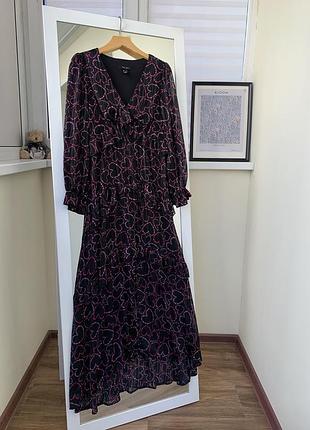 Платье миди у сердечка Размер S Полуобхват груди 44 см Сбоку на замке Полуобхват талии 36 см Рукав 59,5 см Длина 127/140 см Имеет подкладку Спереди имеет разрез внизу юбки Подкладка идет к разрезу юбки С люрексовой нитью Материал: полиэстер Состояние: идеальный