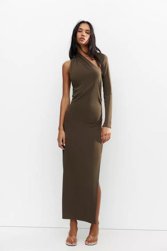 Длинное платье с асимметричным воротником хальтер и шарфом. Боковой разрез внизу. ТЕМНЫЙ ХАКИ | 5644/324/507