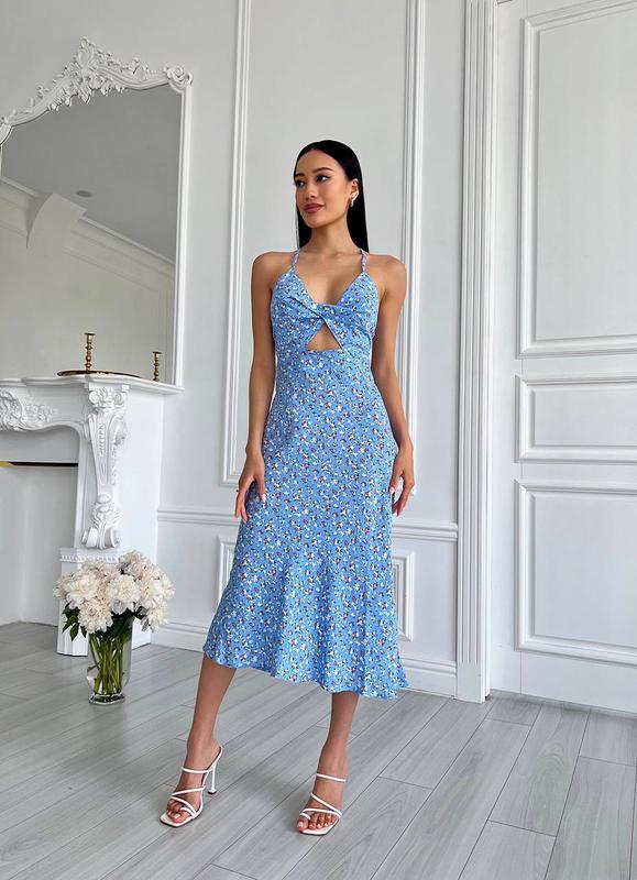 Летнее платье миди с открытой спиной и трендовым вырезом на талии.