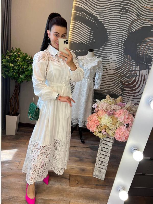 роскошное белое платье макси изысканного кроя, выполненное из высококачественного креп-котона и шикарного кружева, подойдет для множества мероприятий, будь то свадьбы или коктейльная вечеринка или семейное торжество. платье прямого кроя вверху с заниженной фигурной отрезной талией плюс шикарной юбкой внизу, длинными рукавами на манжетах, изящным отложным воротником, идеально будет смотреться на девушках с разными типами фигур платье нереально красиво смотрится, оно несомненно займет достойное место в вашем гардеробе и сердце размер 46-48 длина 135 см, длина рукава от шеи 69 см, о г по изделию 104 см, длина от шеи до талии 51-53 см (спинка чуть ниже передней части) код 329 цена 1900грн