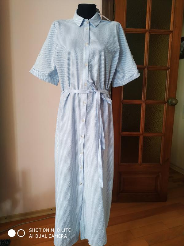 Новое, с бумажным платьем -рубашка Primark Ткань фактурная, приятная к телу, немножко тянется 59% бавовна 40% полиэстр 1% еластан Размер указанный 14( наш 48-50) Седает свободно, рукава регулируются Измерение плечи 41 пог 53 поб 54 длина 130