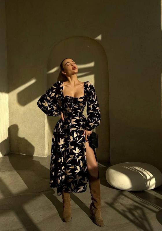 Платье миди длинная легкая женская цветочный принт с разрезом длинные объемные рукава откр...