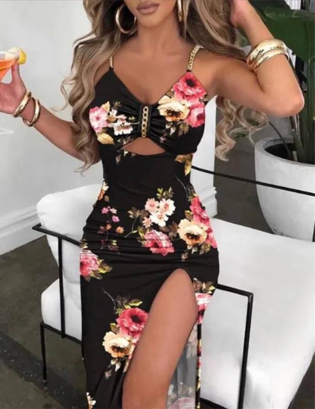 Черное платье миди в цветочный принт с большим разрезом на юбке и позолоченными цепочками-шлейками. Состав 100% полиэстер Размер L