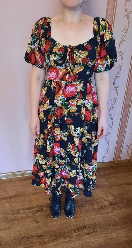Платье в цветочный принт.Меет два кармашка, позади на спинке резинка.длина миди.размер с.ткань креп -шифон,очень приятная к телу.