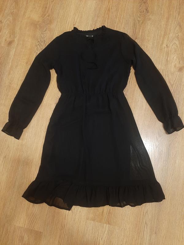 Платье черное DeFazio 38 размер, одевала 1 раз. Длина от плеча 95 см, ПОТ 35 см. На рукавах и поясе есть резинки, снизу - рюш. Есть подкладка. Состав: полиэстер. Платье удобное.
