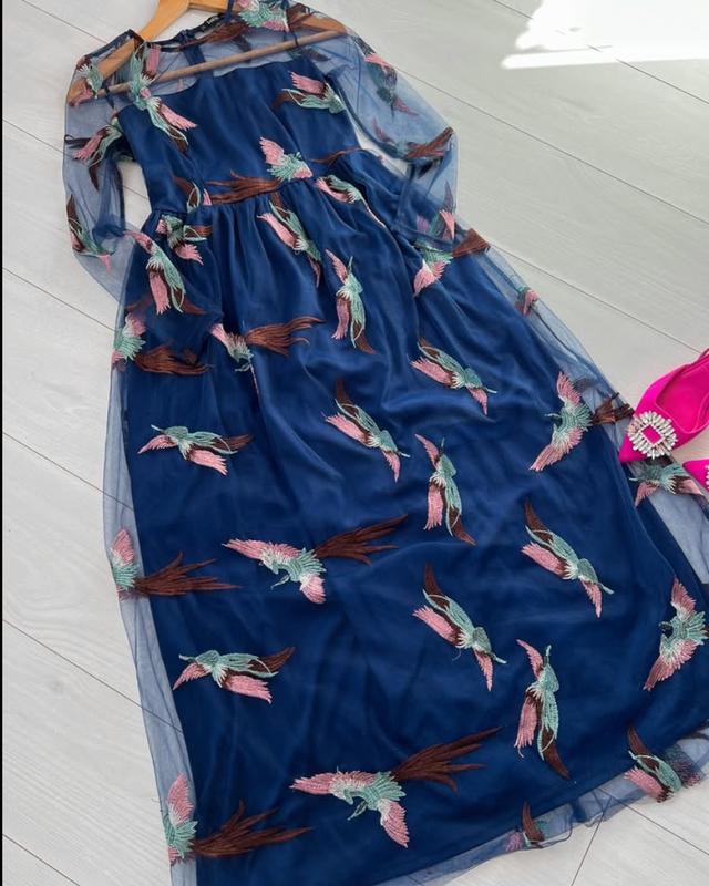 синее платье с вышивкой птичек размер М полуобхват: грудь-40см(тянется до 45см) талия-36см(потянется до 40см) бедра-свободно рукав-55см Длина платья-130см