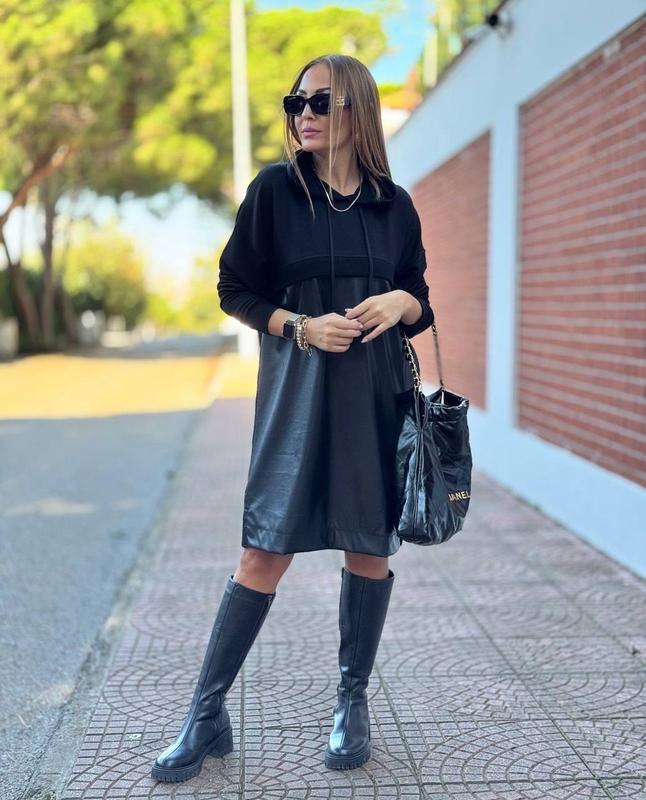 🌷Мод 1383 🖤Стильное платье в стиле спорт-шик 🖤Размеры: 42-46, 48-50, 52-54, 56-58 🌷Ткань: качественная двунить которая обладает хорошей растяжимостью и натуральным составом ткани + эко кожа 🖤Платье имеет капюшон со шнурком 🌷Сезон: осень/зима/весна ✅Качество отличное ❗️ВЫМЕРЫ: 42-46 ОГ 107, ОТ 110, ОБ 114, рукав от капюшона 70, длина изделия 95 48-50 ОГ 118, ОТ 120, ОБ 124, рукав от капюшона 71, длина изделия 96 52-54 ОГ 126, ОТ 128, ОБ 132, рукав от капюшона 72, длина изделия 97 56-58 ОГ 134, ОТ 136, ОБ 140, рукав от капюшона 73, длина изделия 98 ❗️НА МОДЕЛИ РАЗМЕР 48-50❗️