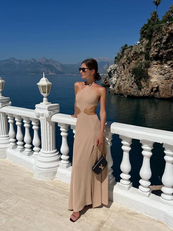 Платье миди из американского крепа с открытой спиной и разрезом на животе и ноге