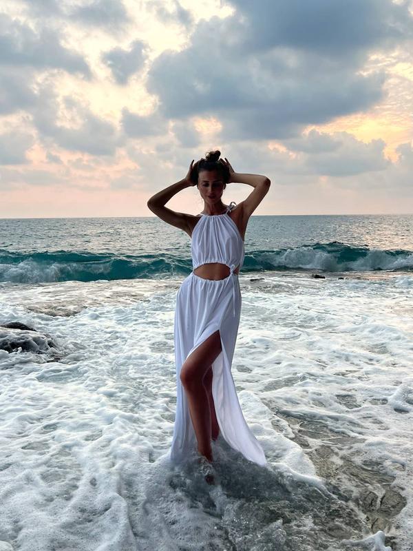 Платье миди с вырезами на животе и спинке, платье на бретелях с разрезом на ноге