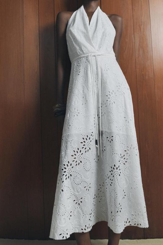 ZARA WOMAN COLLECTION Платье средней длины из 100%-го штапельного хлопка. Хальтерный вырез и открытые плечи. Ремень из той же ткани с завязываемыми петлями. Прорезная вышивка в тон. Глубокий вырез сзади. Подкладка. Скрытая молния. 100% Хлопок