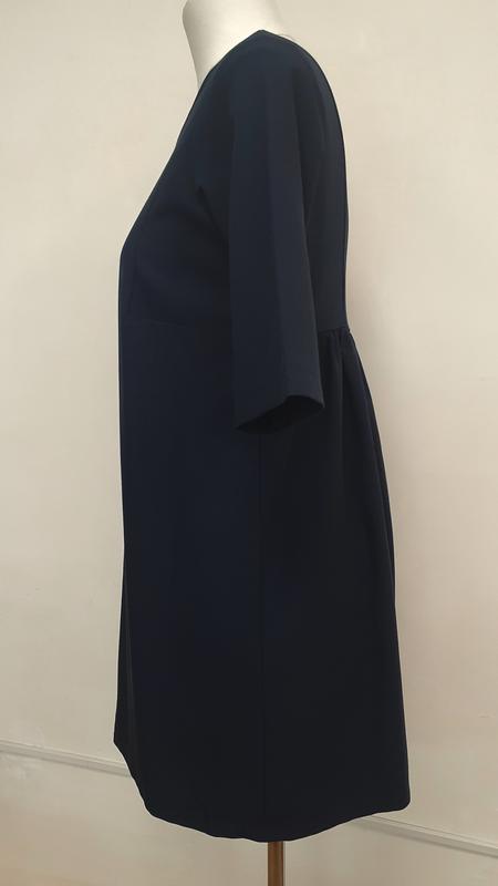 Сдержанное, закрытое платье. Синего цвета, приталенная на груди и свободная к низу. Рукав 2/4. Тканина костюмного типу. Платье на подкладке, ткань очень немножко тянется. Застегивается на спинке на замочек. По спинке отрезная кистей талии. Красиво выполнены рельефы - вытачки спереди. Размер М, может быть на маленькую Л. Ориентируйтесь также по замерам Длина =89 Пог=48 Пот=свободно Поб=свободного По по низу виробу =65 Длина рукава =34.5