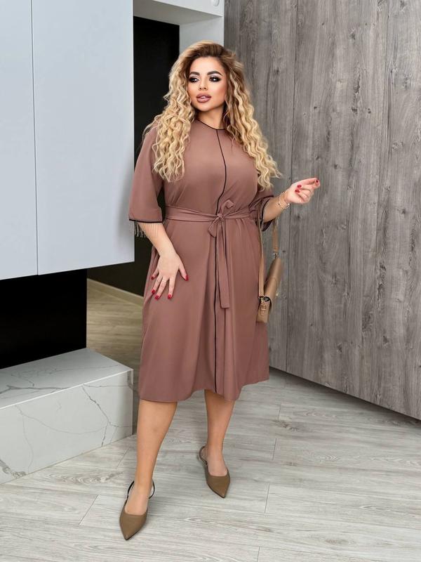 ✅✅✅НОВИНКА✅✅✅ Платье Модель 1034vl Размеры : 46-48,50-52,54-56,58-60 Тканина : софт Цвета: капучино Платье свободного кроя, украшенное металлической бахромой на рукавах и черным кантом, который делает силуэт более утонченным. Рукав прикрывает локоть, длина платья ниже колен. Пояс в комплекте, можно корректировать талию. Замеры ИСПОЛЬЗУ (поглянитесь по размерной таблице): Размер 46-48 Объем груди 110 Объем талии 120 Длина рукава от шва 40 Бицепс 36 Плечи 38 Длина по спинке 108 Размер 50-52 Объем груди 116 Объем талии 126 Длина рукава от шва 42 Бицепс 40 Плечи 39 Длина по спинке 109 Размер 54-56 Объем груди 128 Объем талии 138 Длина рукава от шва 43 Бицепс 42 Плечи 42 Длина по спинке 110 Длина ремня 150 Размер 58-60: Объем груди 136 Объем талии 136 Длина рукава от шва 44 Бицепс 44 Плечи 44 Длина по спинке 111 VL