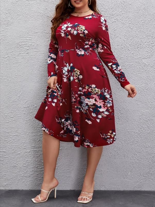3xl красное платье миди в цветы shein, платье с длинным рукавом, платье большой размер