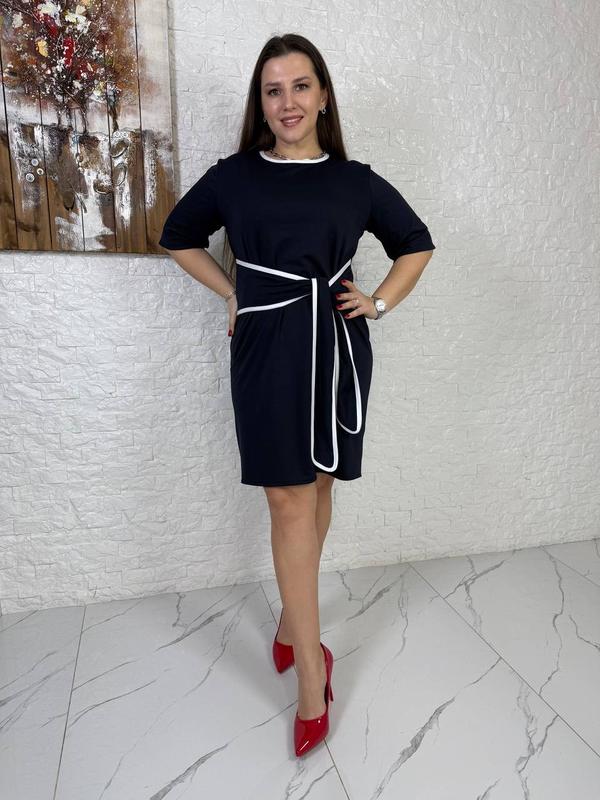 Платье с завязками Модель 1040vl Цена : 1180грн Размеры : 46-48,50-52,54-56,58-60 Цвета: бордо, синий, черный Тканина : двонитка Платье с интересным кроем : по бокам два каната из основной ткани, можно завязывать спереди и сзади, короткий рукав, который прикрывает локоть, длина до колен