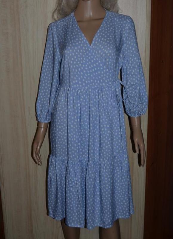 Многоуровневое голубое платье на запах принт горох Primark с V образным вырезом горловины Размер 14 Стан - идеальный Состав: 100% вискоза ПОГ - 52см ПОТ - 50см ПОБ - 65см Рукав - 47см Длина - 99см