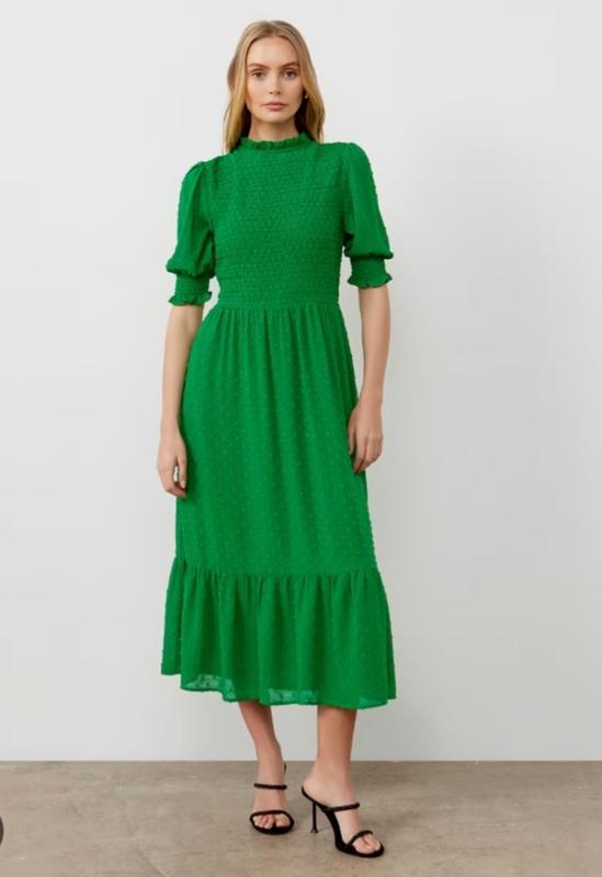 Платье миди с круглым вырезом, Loretta имеет многоуровневый подол и шов в стиле ампир на груди, что создает классическую посадку и расклешенную форму. Изготовленное из жатого жоржета, Loretta также имеет присборенный бюст и короткие рукава-фонарики с эластичными манжетами. Размер 14 Замеры длина 123 см Полуобхват груди 45 см без натяжки Полуобхват пояса 41 см Плечо 9 см. Длина от плеча до талии 40 см