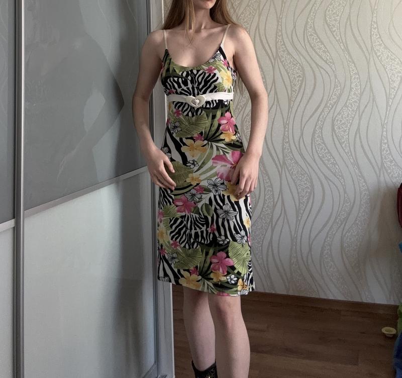 Яскравий, літній варіант у стилі 2000-х. Має облягаючий крій, тонкі бретельки, які регулюються. Принт поєднує в собі тропічні квіти, зелене листя та чорно-білий зебровий візерунок, що створює контрастний і екзотичний вигляд 🪷 Додатковим акцентом є білий пояс із декоративною пряжкою у формі серця, який підкреслює талію. Виглядає дуже ніжно та ефектно. Гарно тягнеться. Розмір: S/M