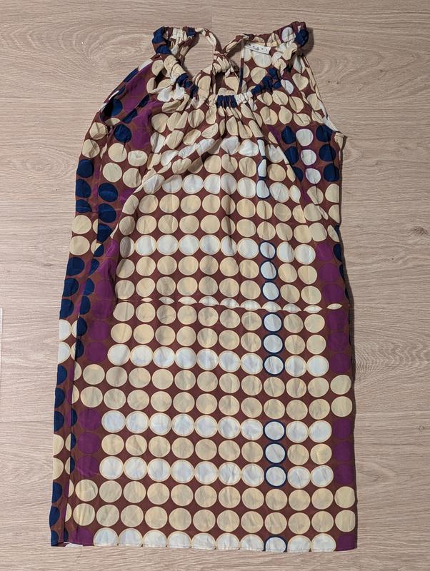Платье без рукавов из коллекции Marni для H&M 2012 года. 100% шовк. Сзади красивый вырез и роскошный бант. Имеет два кармашка. ПОГ и ПОС - 55 см Длина 95 см. Лучше смотрится, когда сидит свободно. Состояние отличное. Единственный нюанс (последующее фото) – сзади у шва немного полезли нити, эту проблему легко решить и ателье. В цене учтены.