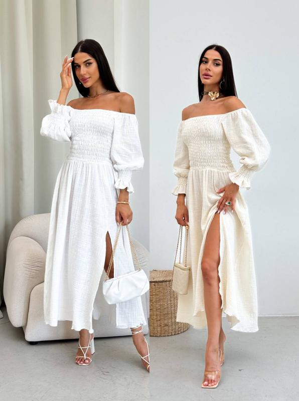 Нежное хлопковое платье 🕊 Модель 7030 ▫Ткань: лен-муслин, хлопок 100% ▫Размерный ряд: 42-46, 48-52 ▫Цвета: беж и молоко ФОТО РЕАЛ Идеальное легкое платье на резиночке, с разрезом на ноге🥰 Идеально подойдет под любую обувь, очень легкая и удобная 💌 Можно носить с закрытым и вскрытым плечом🌸 Под загоревшие ножки - именно то 🌞