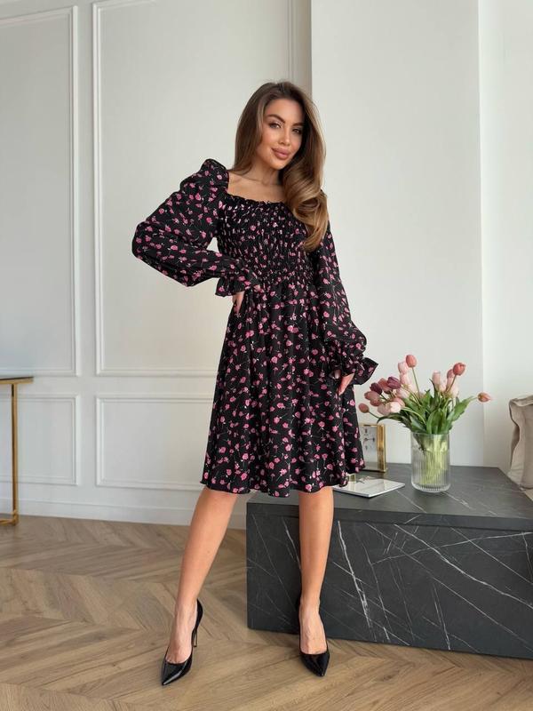 арт. sat. 5627 Размеры: S, M, L, XL Тканина: софт принт Цвет: черный и белый С настрочной резинкой по груди и спинке, рукава и плечи также на резинке, благодаря чему регулируете платье. Отличное качество.