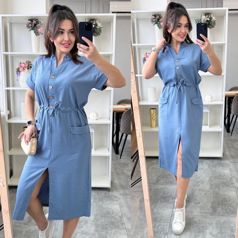 Лляна сукня Сукня довжини міді, попереду розіз, має дві накладні кишені, спущений рукав, талія регулюється куліской, комір стійка Тканина: льон Склад: 50% льон, 50% віскоза Розміри: XS-S(40-42), S-M(42-44), L-XL (46-48), 2XL-3XL (50-52) Кольори: чорний, беж, моко, хакі, джинс Ціна: 910 грн