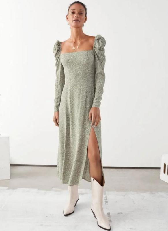 Очень красивое платье миди в принт из 100% вискозы от & Other Stories.Квадратный вырез.длинные присборенные рукава сверху и эластичная вставка на спинке. Разрез сбоку. Застежка на молнию сбоку и на рукавах. Размер 34 160/80А Состав : 100% вискоза Длина - 125 ПОГ - 38-44 ПОТ - 32 ПОС - 48 Рукав - 60 Разрез - 50