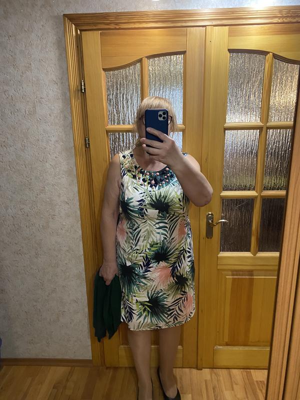 Летнее платье из коттона, подкладка из полиэстера. Цвет белый в зеленых и розовых листьях. По горловине кокетка спереди расшита черными и розовыми декоративными элементами. Сзади длинная молния, но не до самой шеи: вверху образуется небольшой треугольник, а заходящая на спину кокетка застегивается на 2 пуговицы. Внедумия юбки шлица. Сукня приталена. Сукня футляр. Размер указан 18. Я примеряю на 18 (44), 165 см. Платье полностью по мне, если вы не любите в утяжелении, то лучше брать на размер меньше. Длина мне до колена.Замеры НОГрудей 54 см Талия 51 см Стегна 56 см Длина по спинке 96 см Без рукавов Плече 7 см